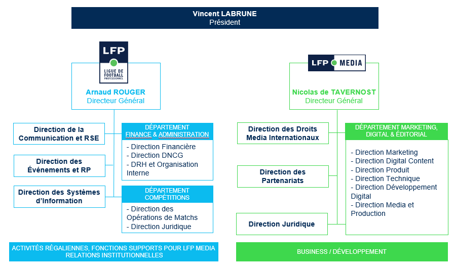 La Ligue de Football Professionnel (LFP) assure la gestion des activités du football professionnel en application et en conformité avec les règlements de la Fédération Française de Football.